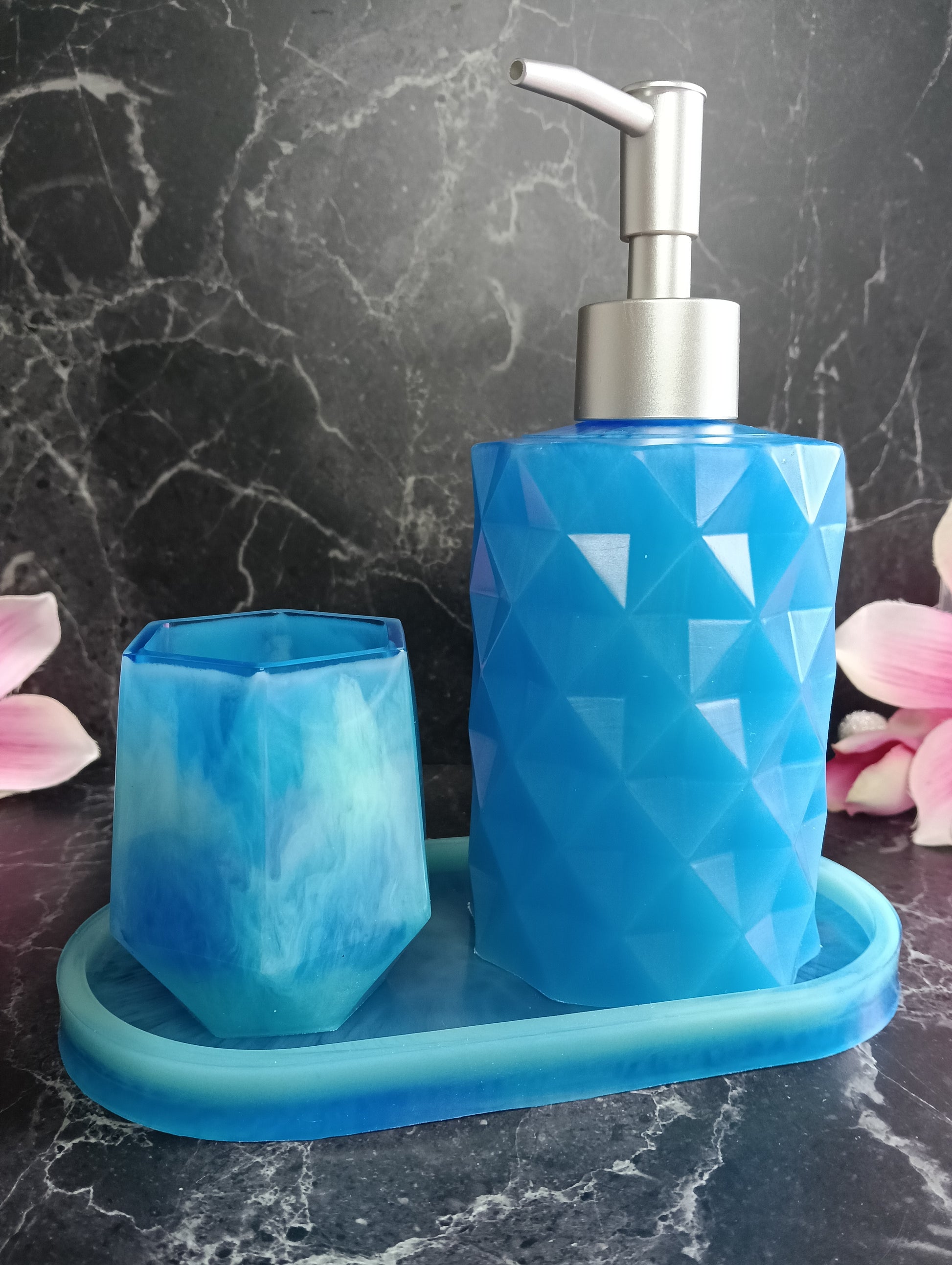3-teiliges Badezimmer Set aus Epoxidharz- bestehend aus einem Seifenspender, einem Tablet und einem kleinen Becher.