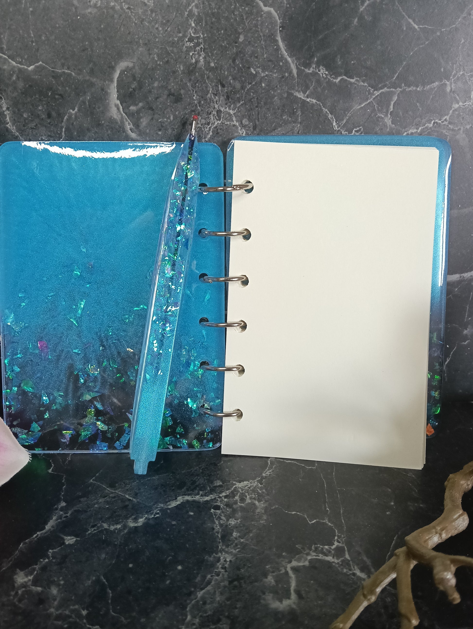 Kein Problem mit dem kleinen Notizbuch - Set in DIN A5 und dem dazu passenden Kugelschreiber mit blauer Mine, beides handgegossen aus Epoxidharz.